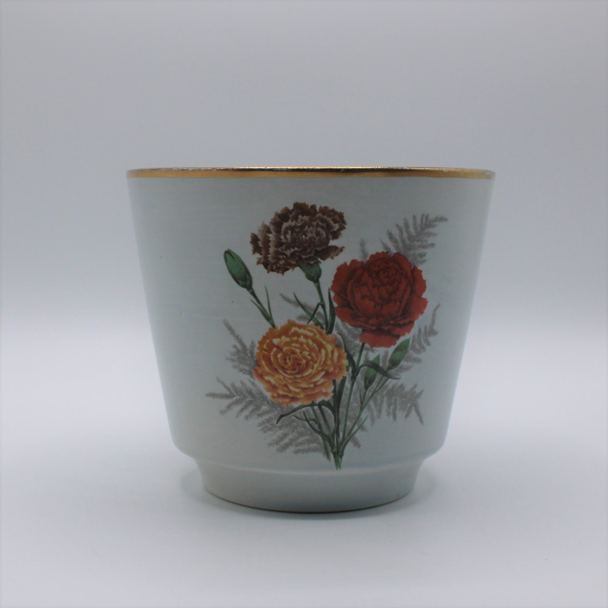 Vintage retro bloempot met anjermotief Vintage staat Gouden rand aan bovenzijde Afmeting: h 13,5 doorsnede 15,5 cm