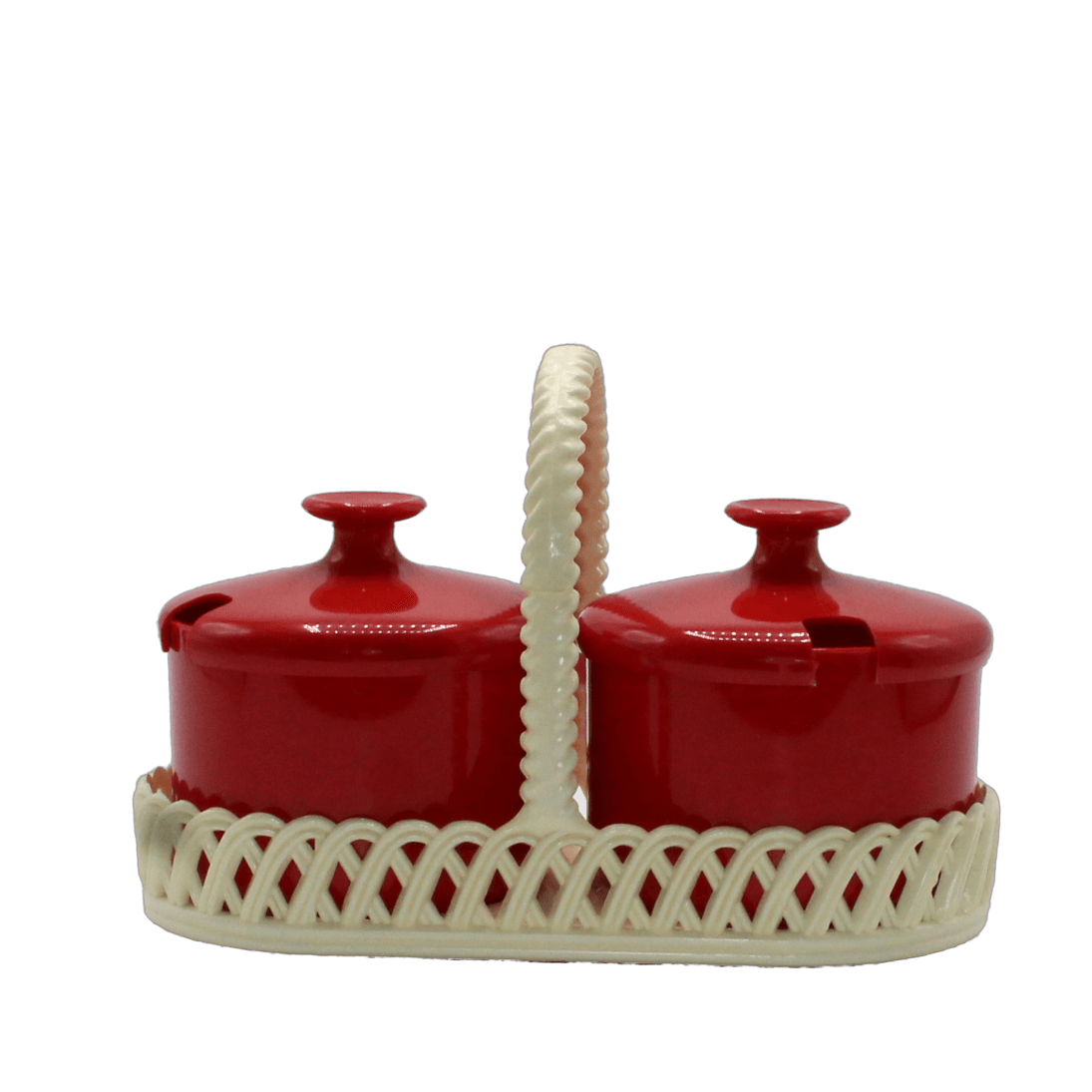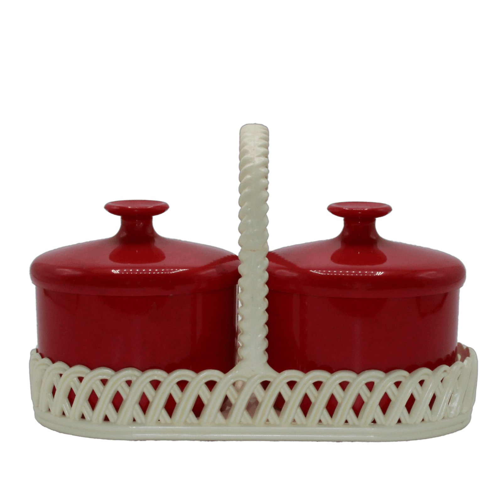 Afmetingen: mandje h 12 cm x b 17.5 cm x d 8.5 cm. Potjes h 10 cm doorsnede 8 cm