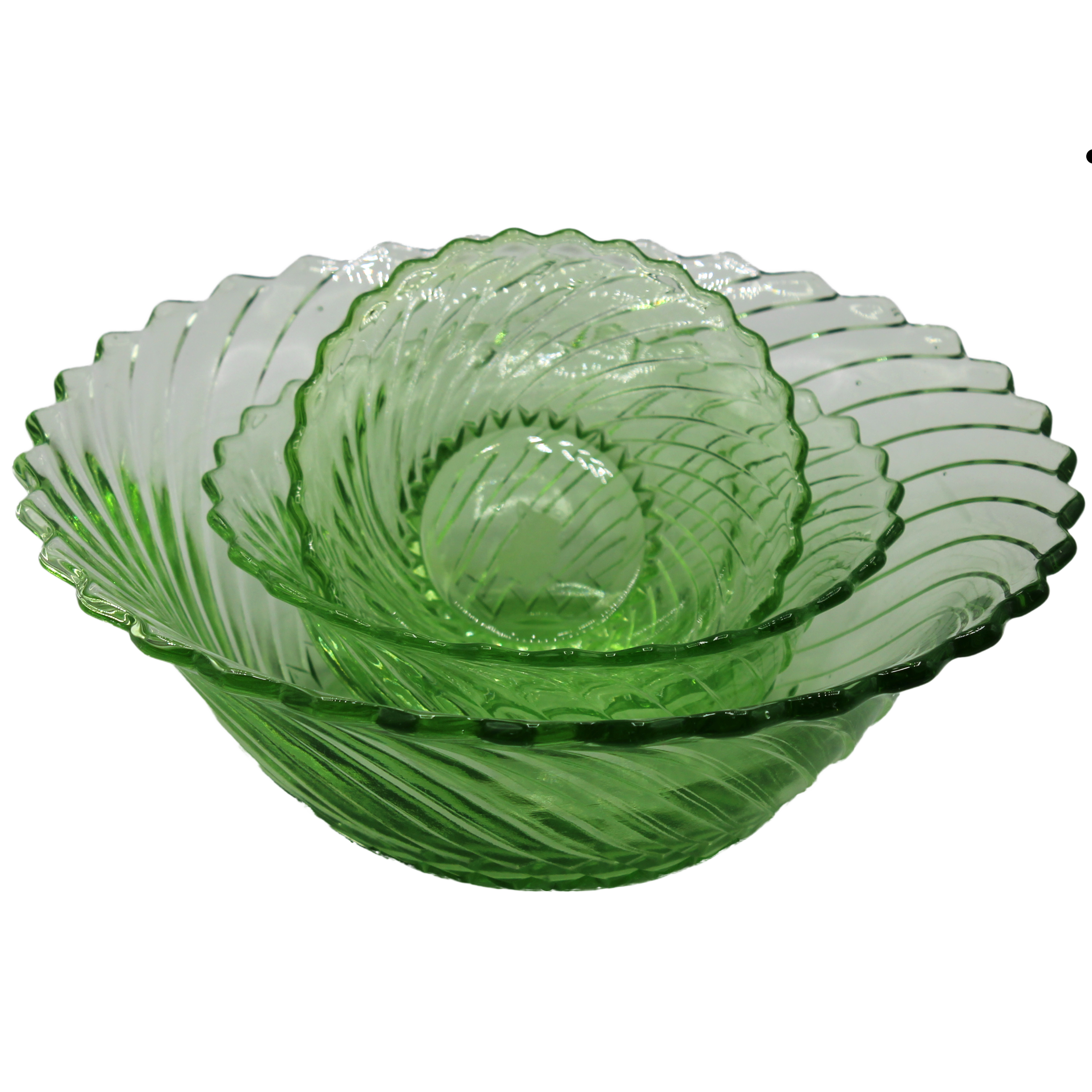 Afmetingen: hoogte 8 cm diameter 22 cm / hoogte 6 cm diameter 14.5 cm / hooogte 4.5 cm diameter 11 cm Kleur: groen Merkteken: bodem schaal zie foto Schade: geen