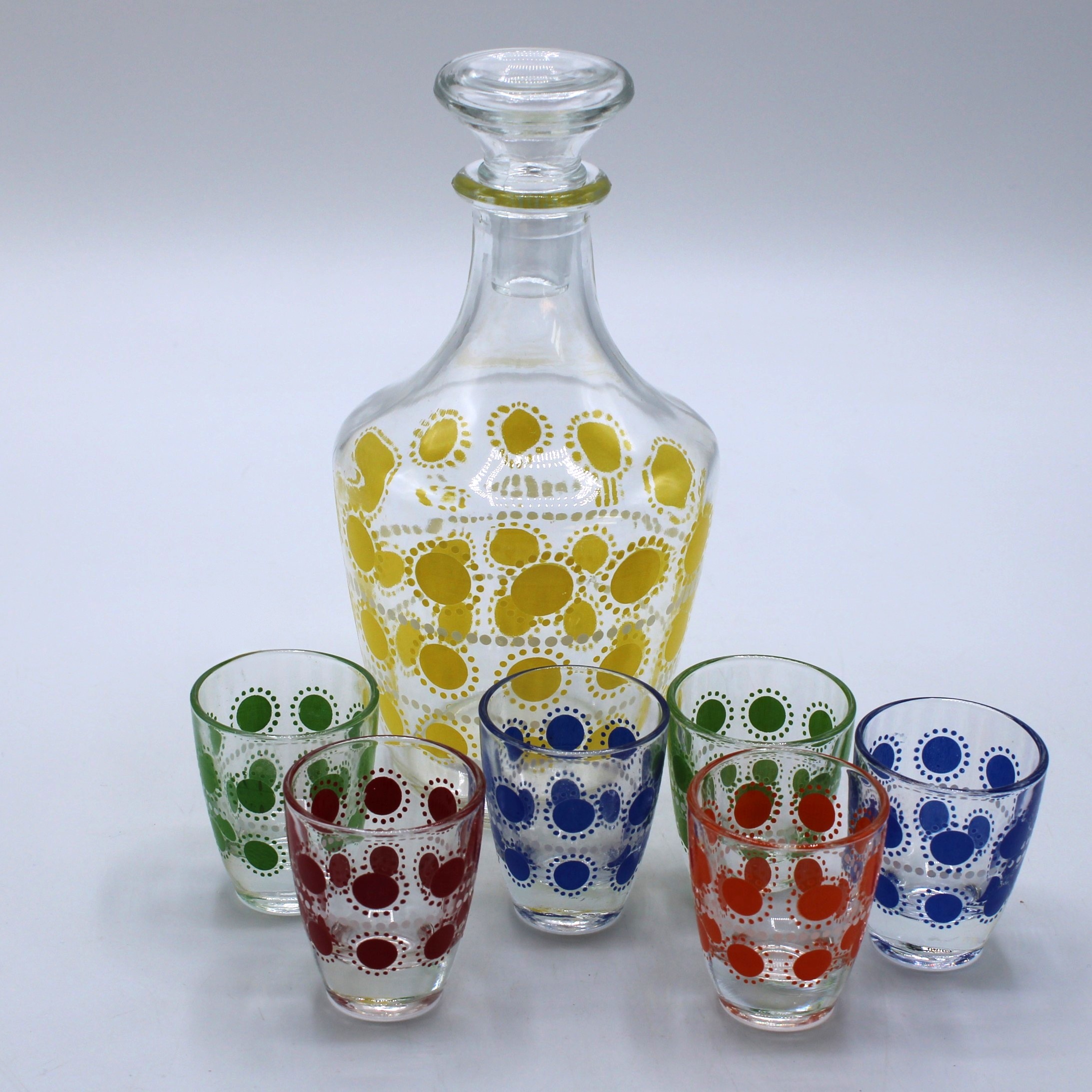Afmetingen: hoogte karaf 18 cm hoogte glas 5 cm doorsnede 4 cm Kleur:zie foto Merkteken: geen Schade: 1 glaasjes heeft een plekje op de rand
