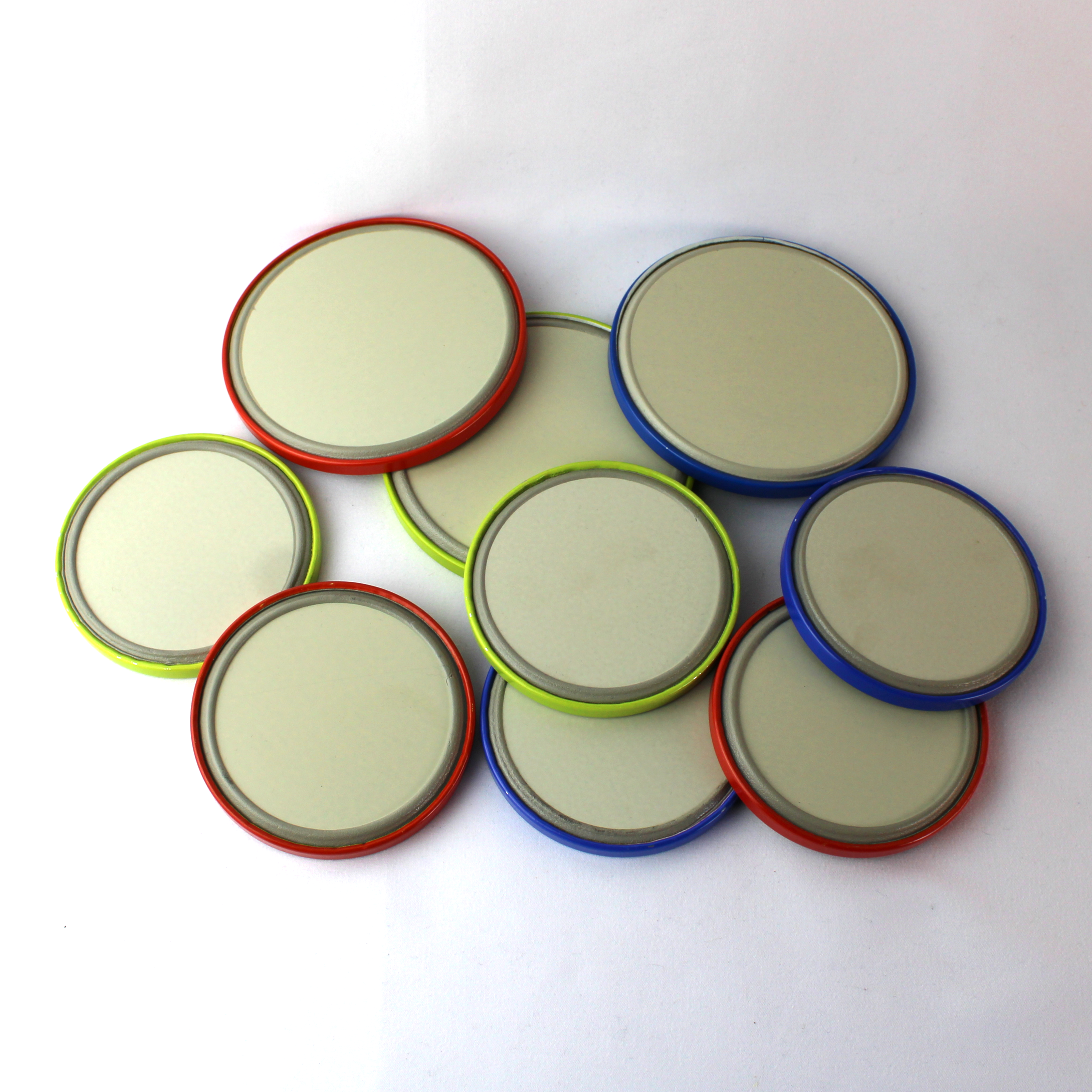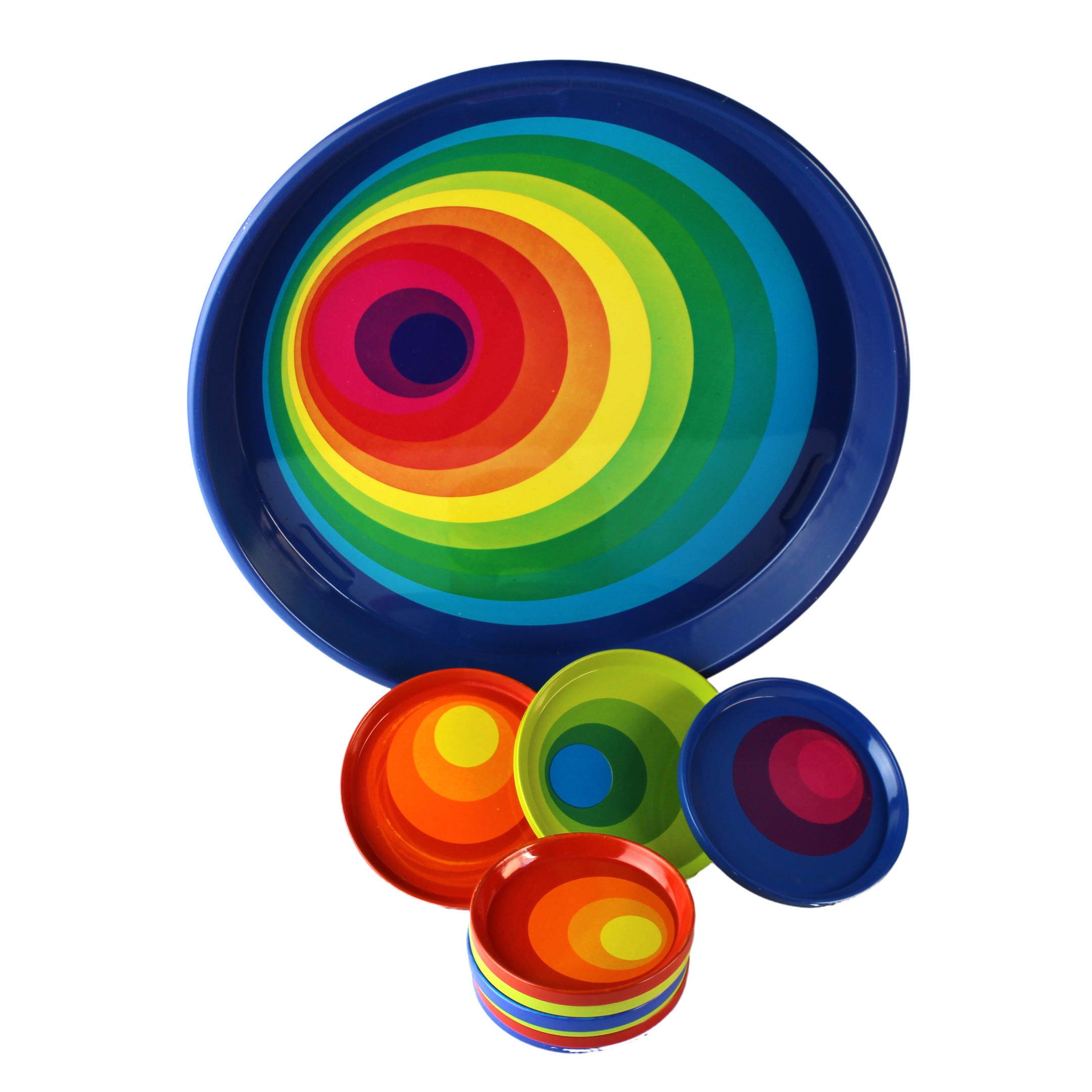 De set bestaat uit een dienblad met 3 grote onderzetters en 6 kleine onderzetters