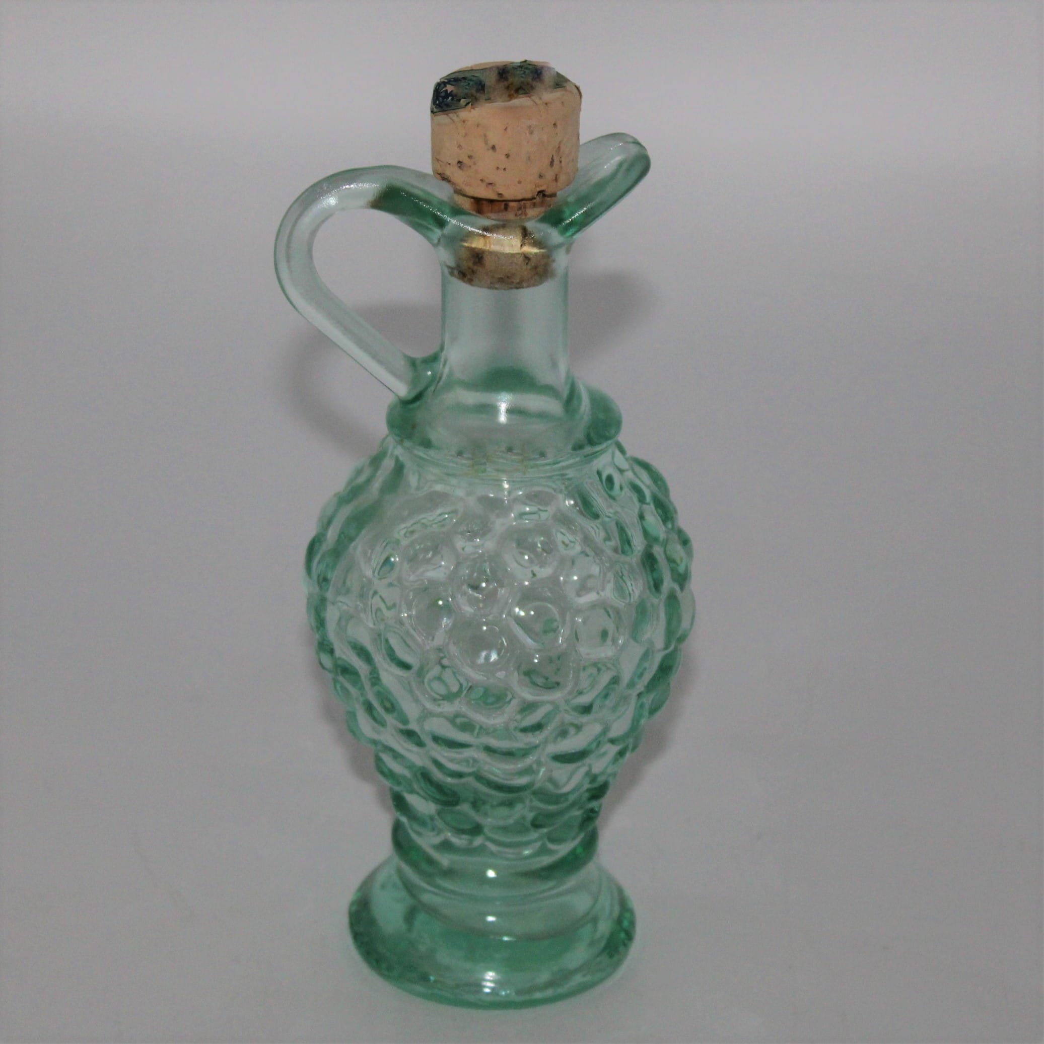 Vintage groen glas wijn karaf Karaf in de vorm van een druiventros Karaf heeft kurk als afsluiting Afmetingen: hoogte 19 cm Kleur: groen glas Merkteken: geen Schade: geen