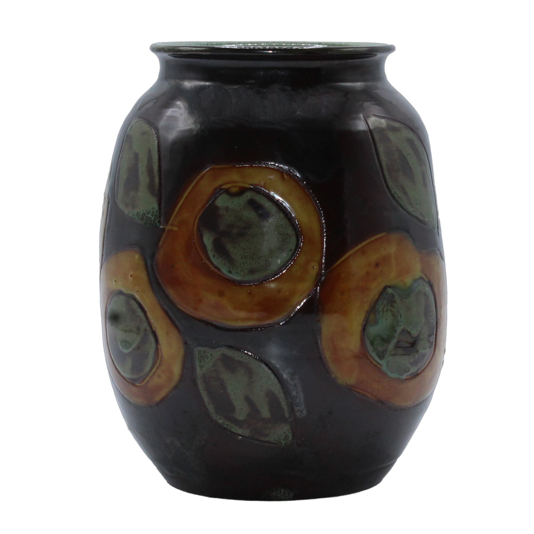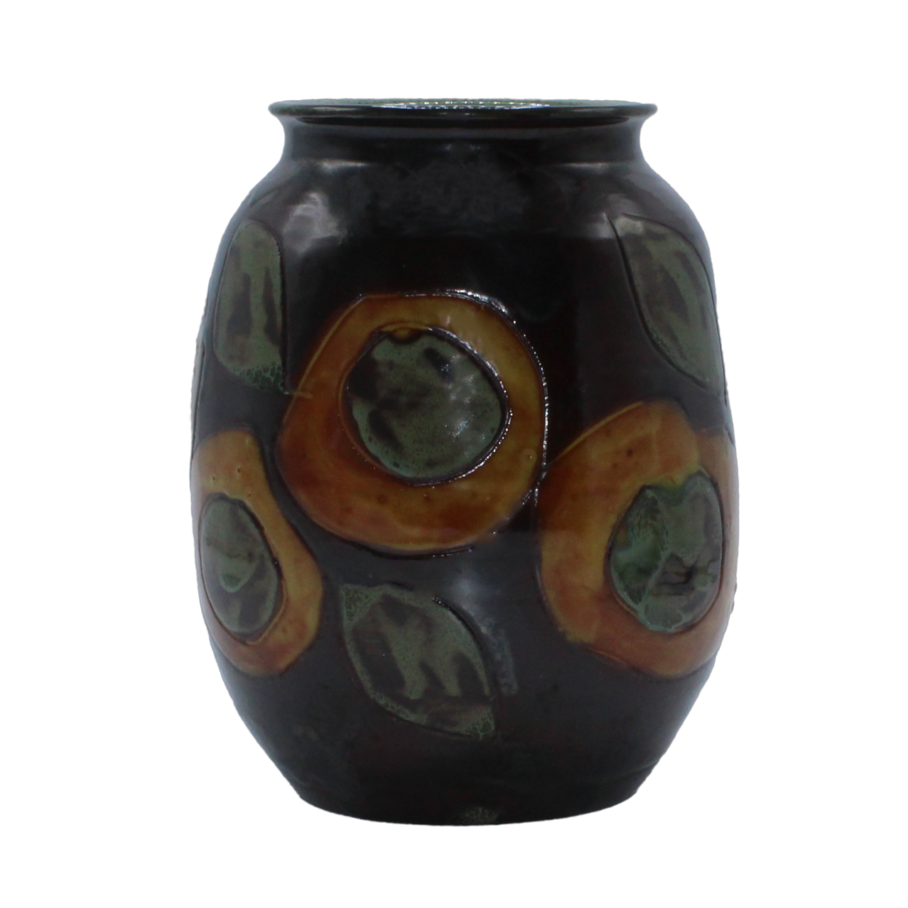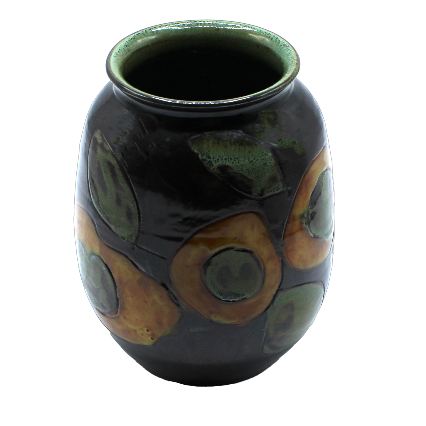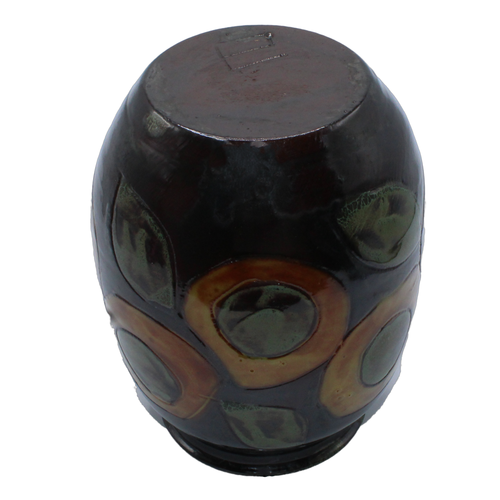 Afmetingen: doorsnede boven 10 cm hoogte 18 cm Kleur: bruin/groen/ donker geel binnenzjde groen Merkteken: bodem Schade: geen