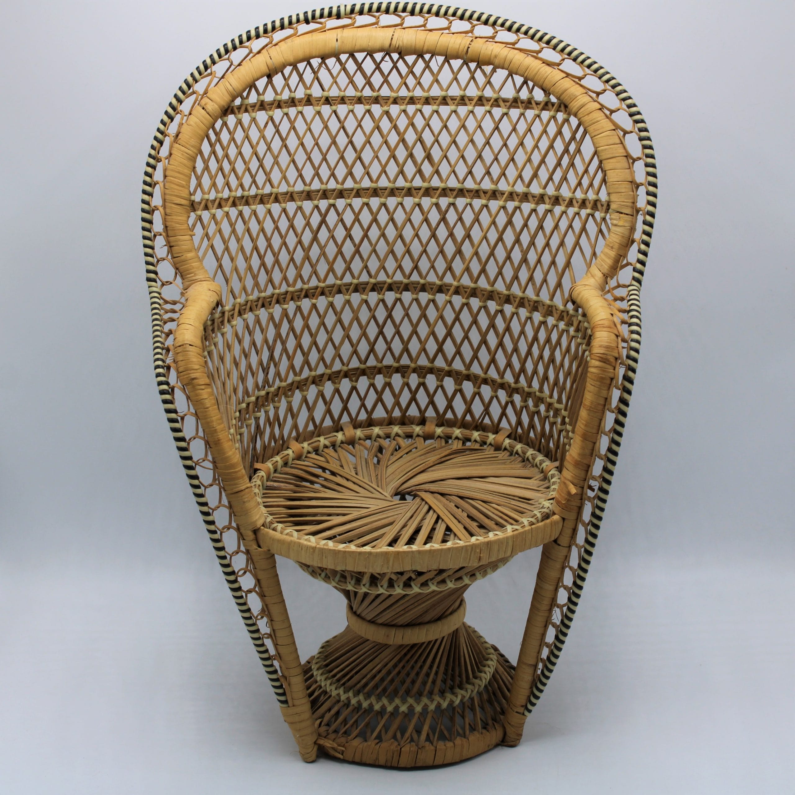 Rotan poppen pauwenstoel -retro poppenstoel afgezet met zwart witte bies van kunststof