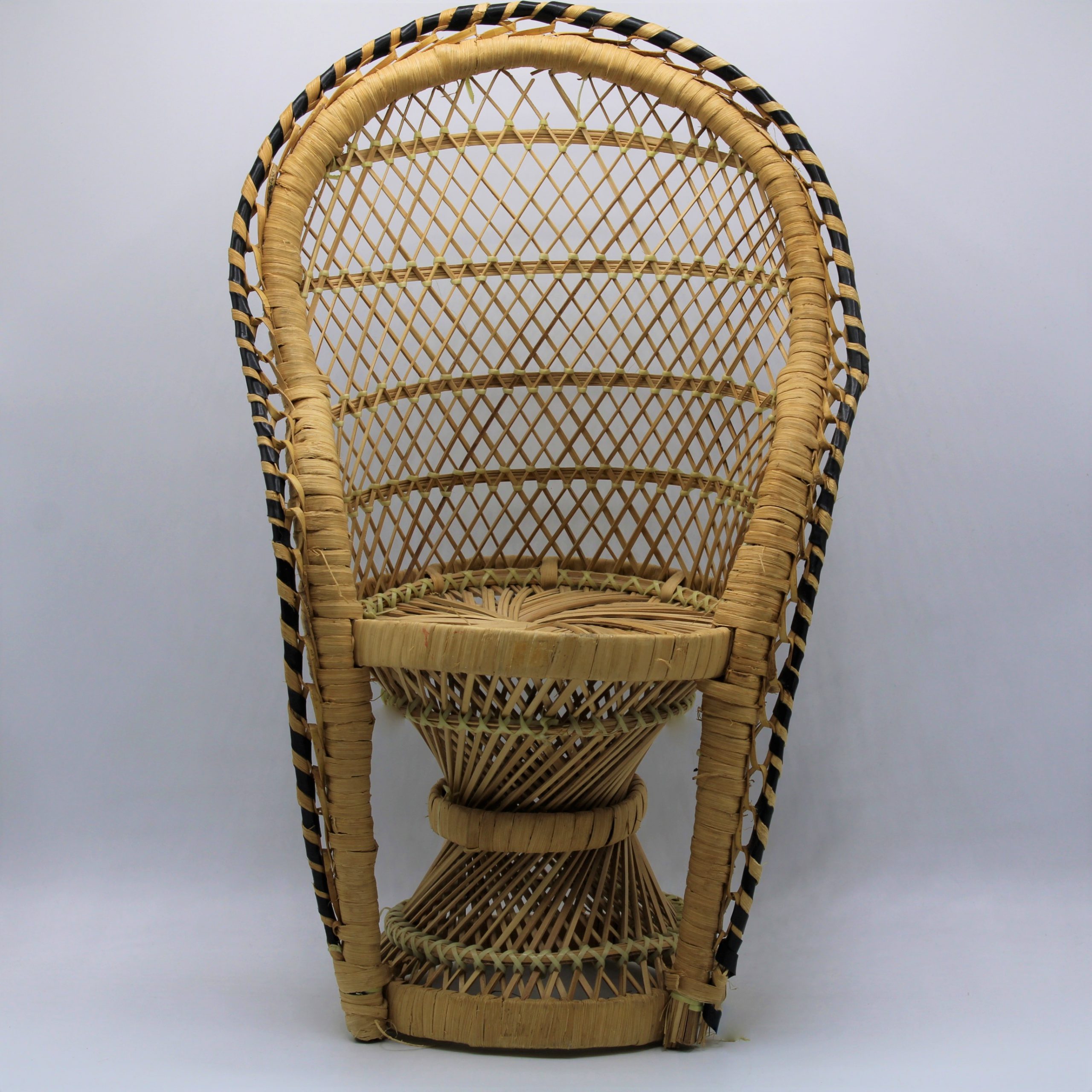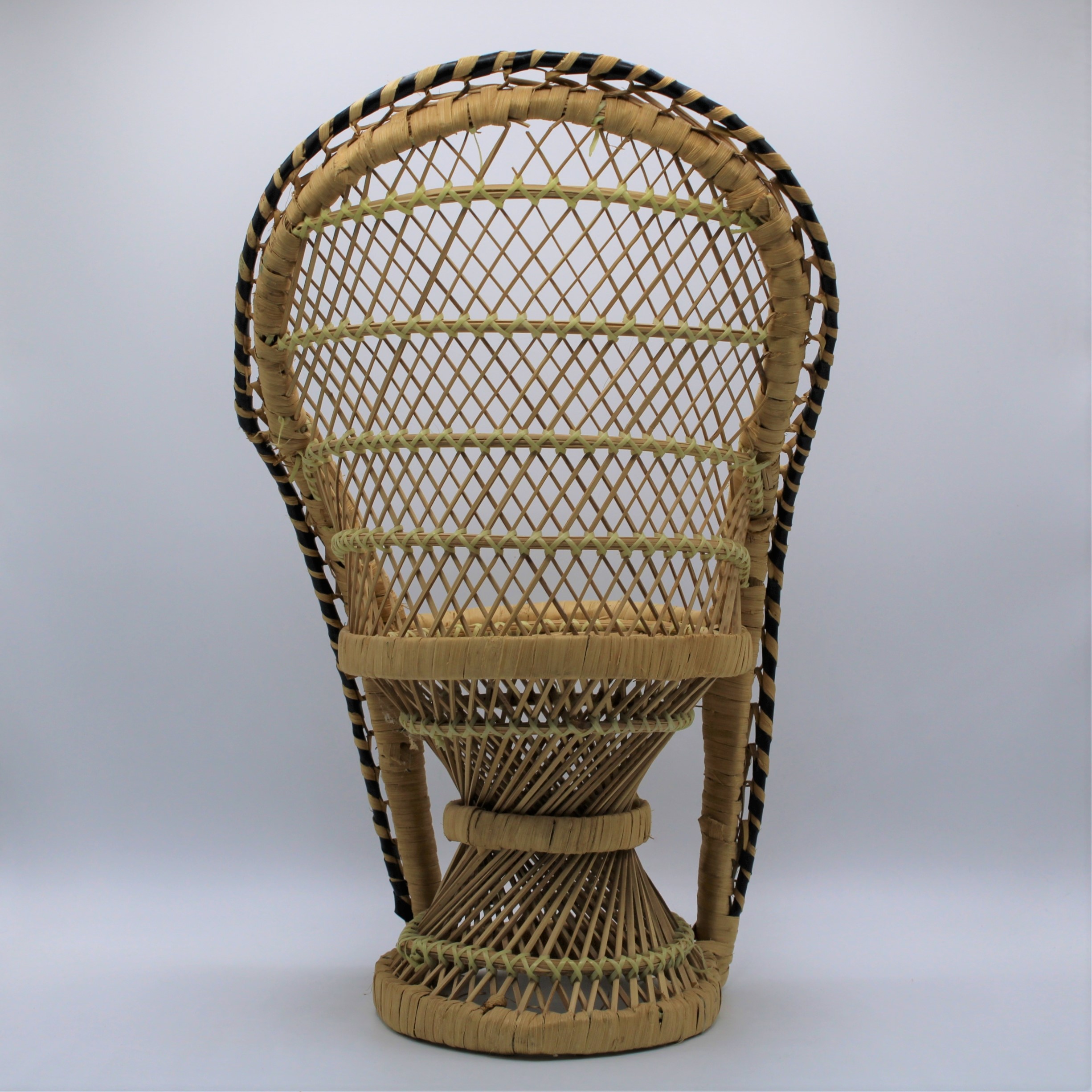 Rotan poppen pauwenstoel -retro poppenstoel afgezet met zwart witte bies van kunststof